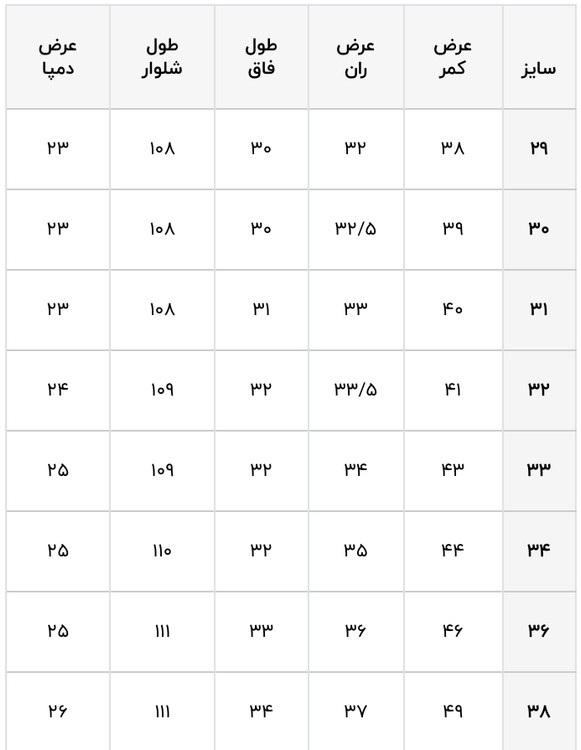 اندازه های ارائه شده در جدول زیر +/- ۱ سانتی متر دارای خطا می باشد