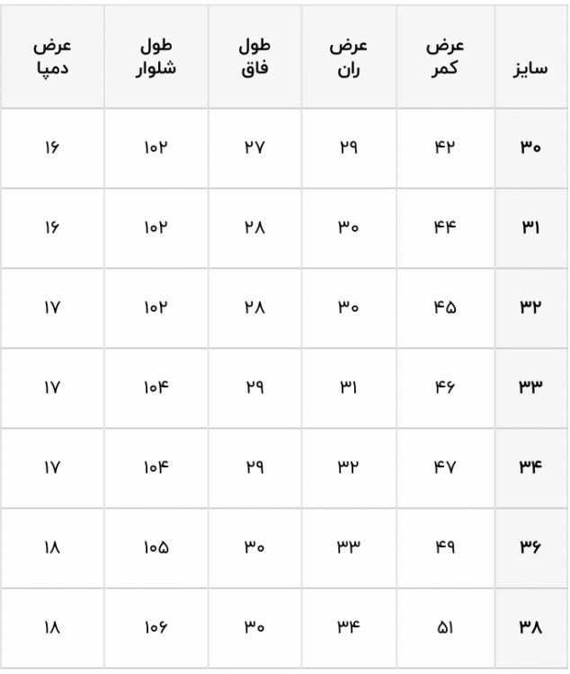 اندازه های ارائه شده در جدول زیر +/- ۱ سانتی متر دارای خطا می باشد